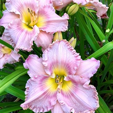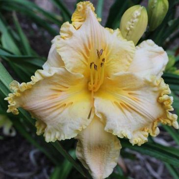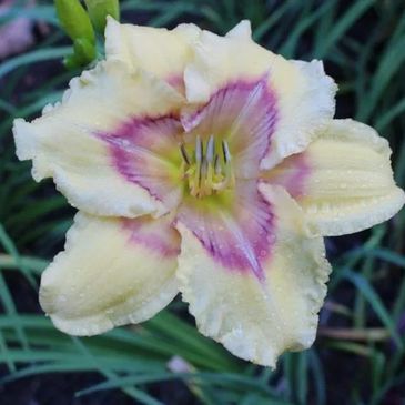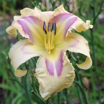 UF Cascade. Soft yellow bloom with large light lavender eye edged with rosy lavender. Green throat; recurved bloom is heavily ruffled. 3 branches and 20 buds. Reblooms.