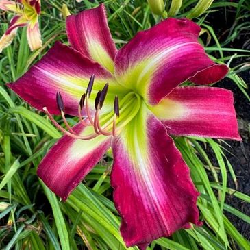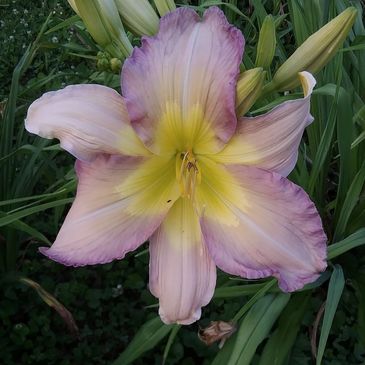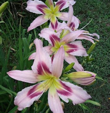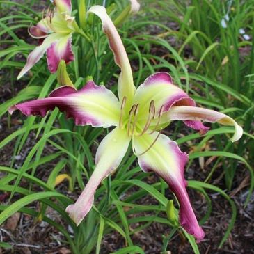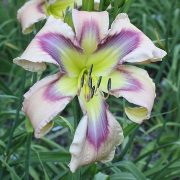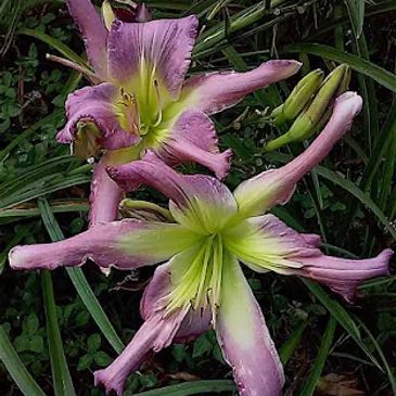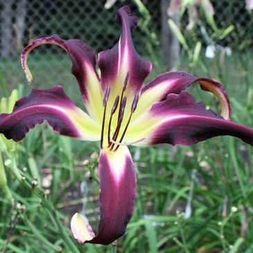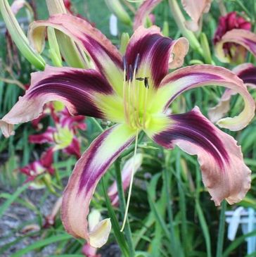 Reddish lavender bi-tone with extremely large cream and green throat. Bud builds for a long time in good conditions, yielding up to 25 buds. The blooms face out and up looking at you. Very sunfast. Pollen fertile only. Excellent children with cool light throats.
