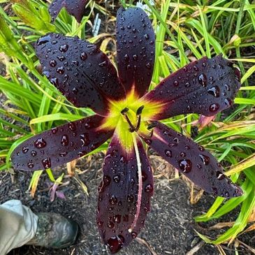 42" Dip 7.5" Mid, Dor, Re UFO Velvety black and bright burgundy to violet blend, darkest at petal centers with lighter midrib, black eye with fiery red and bluish tones between eye and throat, bluish eye on sepals with bright green throat. (Apophis × Black Armadillo)