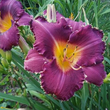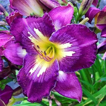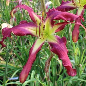36" MLa Re 7.5" dormant diploid. Unusual Form-crispate. Rockfish River is a deep, rich purple with a green throat blending to cream that reaches out onto the midribs. It has strong branched scapes and ruffled blooms at a medium height.
