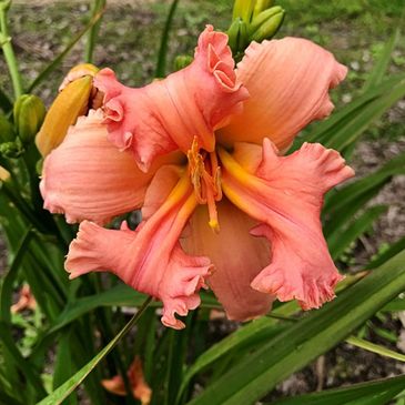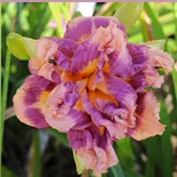 22" 2.75" EM, Rebloom, Semi-Evergreen, Diploid, 15 buds, 3 branches, Double 100%, Melon with a large grape eye and glowing orange throat.