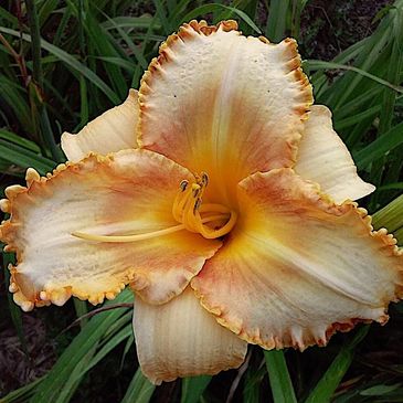 28" Tet 4" SEV Mid-late, SEv, FR, RE, Caramel yellow-orange petals with orange to yellow double edge culminating with piecrust ruffles and some tentacles and teeth, above raspberry eye and glowing orange throat. (Korean Queen × Mystic Butterfly)