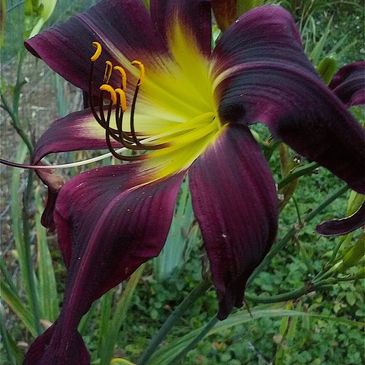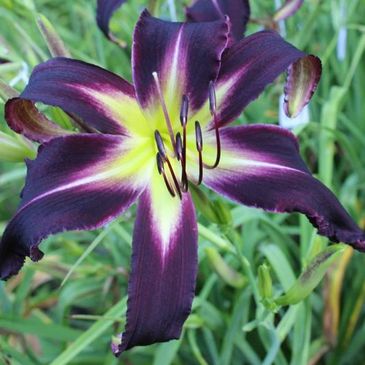 Purple to black with muted black band. Green to cream throat with cream midribs and very narrow white edge on petals. Blooms heavily for about 3 weeks here. Very sunfast for one so dark, thanks to its parentage. Fertile both ways with many interesting purple kids. 3 branches and 21 buds in good conditions.