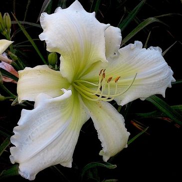Late! Starts in late July and keeps sending up scapes and reblooms through September until frost in late October. Parchment bloom with intense black-purple feathered eye that reaches more than half way to the end of each segment. The throat is lime green. The bloom gently recurves and is ruffled. Well-branched scapes. Pollen fertile.