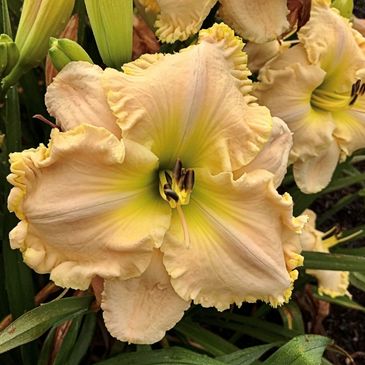 33" 6" ML SEV sculpted Squeaky clean and ready play, this 6 inch deeply pleated boldly reflexed ripe mango dances upon erect 33 inch scapes with wide three way branching. Fertile both ways