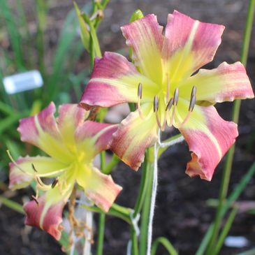 These flat 6 inch soft rose blossoms display a deeper violet pattern and matching gilded edge. Tastefully displayed above the foliage on erect 44 inch scapes and three to four way branching. Very fertile both ways.