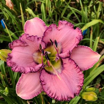31" Dip 7" Early - Midseason, Sev, FR, UF Pale orchid pink petals and a wide, radiating raspberry eye above a wide green throat with radiating pale orchid pink midribs from the throat. (Misty Mountains Cold × (Substantial Princess x Ziggy Played Guitar))