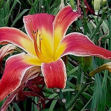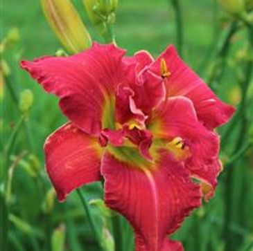 Medium red with large gold and light green throat. Cream midribs. Blooms are very twisty and twirly, very sunfast. Strong scapes. Pollen fertile only. Continuously rebloomS until frost.