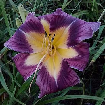 Petals medium purple with lighter bluish purple petal edges and white midribs, big, darker purple eye above large, star shaped, glowing orange to cream throat. Very high rust resistance. The plant is strong growing, vigorous and blooms starting midseason and can rebloom into late season in my garden. The buds are very pale, making a striking contrast with the dark flowers. The color of the flowers is a true grape purple with a darker eye. On some days there can be a considerable bluish cast to the flowers, and on hot, sunny days the flowers often fade on the edges to reveal a very bluish-lavender under-coloring. Fertile.