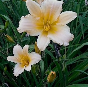 44" ERe 5.5" dormant diploid 3 branches, 22 buds. Lemon cream with patterned lavender-red eye and green throat. Re-blooms, proliferates heavily, and blooms 3 months. Longest blooming of my recent intros. It bud builds and also has some rebloom. Fertile. Passes on the cool eyezone to the kids.