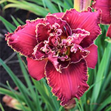 Black red spatulate/cascade with green throat, strong rebloom. Very sunfast. Very black on opening, going to red black purple as the day progresses. Good rebloom. Double rebloom this year, until frost. Fertile, with wonderful sunfast dark kids.